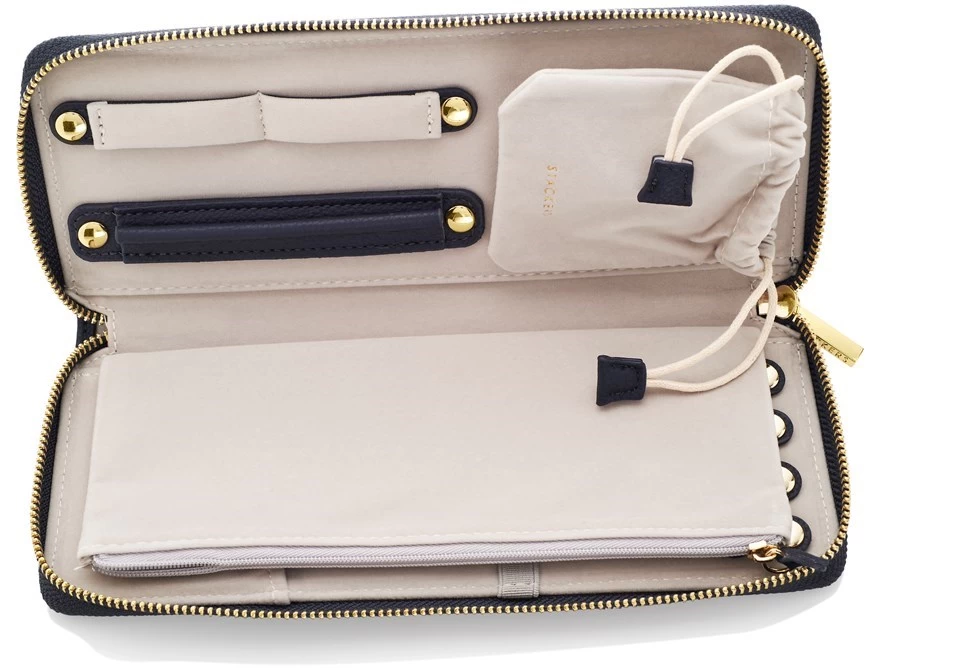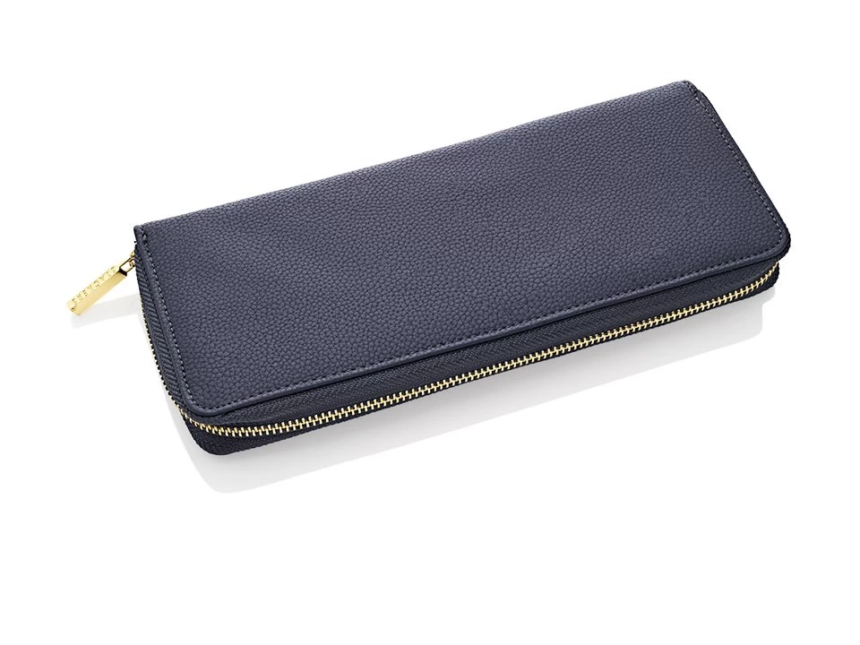 A zip fastening jewellery case in a navy finish designed to safely store your items whilst travelling. Approximate size 25 x 10.5 x 3cm.
