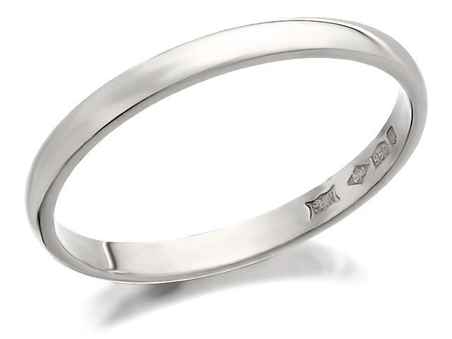 A classic, simple and timeless 2mm wide D-shaped platinum wedding ring with a nicely rounded outer edge and a flat inner edge. Also available in other metals: