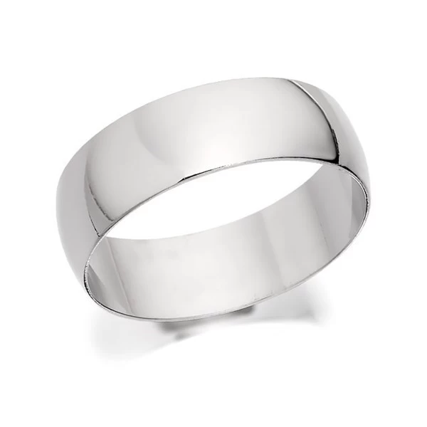 A classic, 7mm wide D shaped wedding ring in platinum 950. Made in the UK.