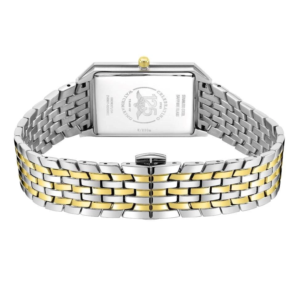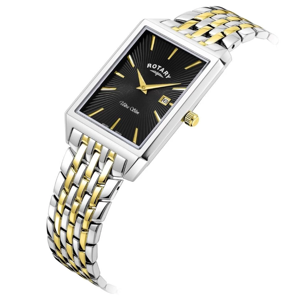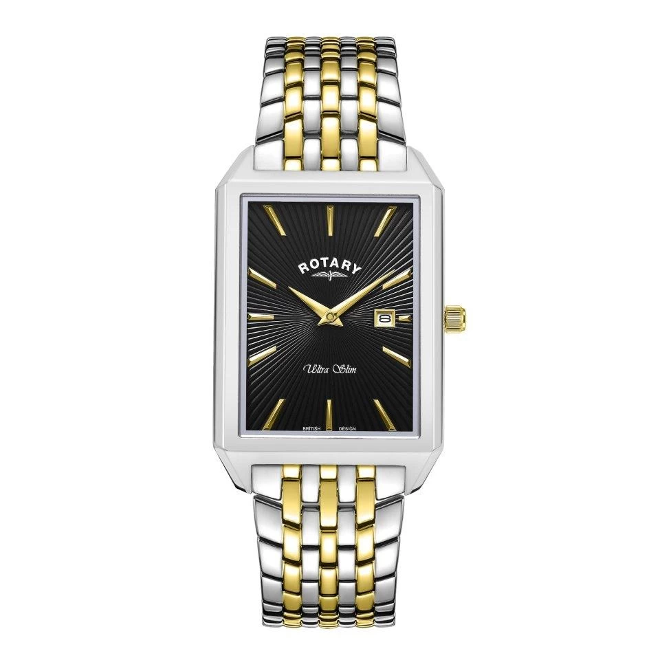 This ladies ultra slim Rotary watch features 28.5mm stainless steel rectangular case with two tone bracelet with double push button folding clasp. The black sunray dial has gold tone baton hour markers and hands plus a handy date display window. This is a timepiece that exudes class. 50m water resistant.