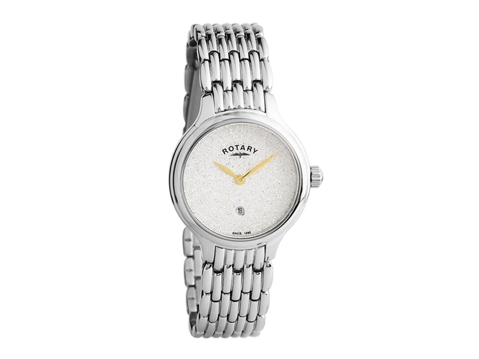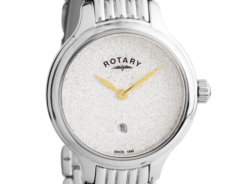 Add a touch of sparkle to your outfit with this ladies watch from Rotary. The 30 x 9mm stainless steel case houses a stunning silver dial with gold tone hands and a date display window. Finished with a 16mm stainless steel bracelet with double puush button folding clasp and 50m water resistant.