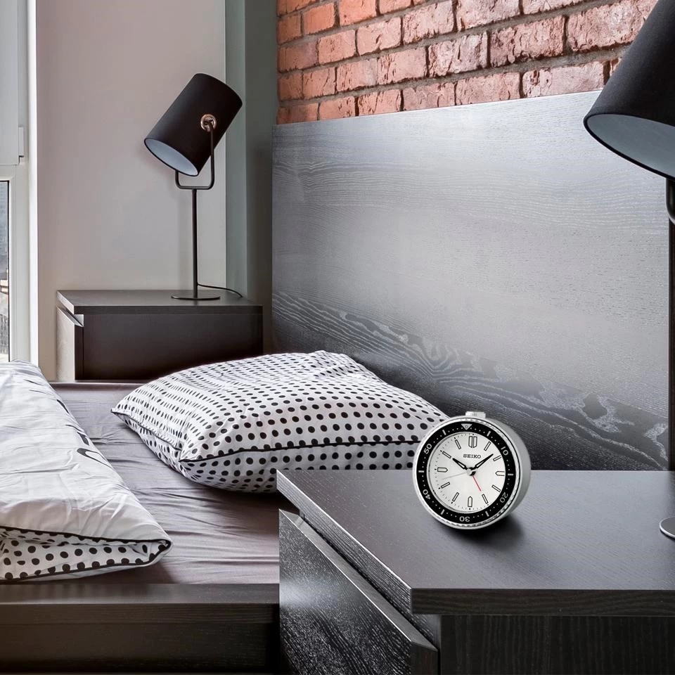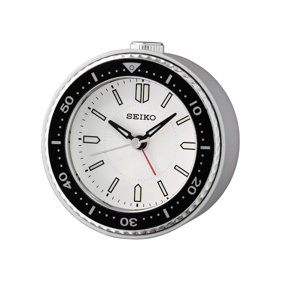 A neat 9 x 5cm silver case alarm clock from Seiko with luminous hour markers and black hands. Finished with a red alarm indicator and a silver second hand all set against a white dial with a numbered black bezel. Powered by 1 x AA battery, not supplied.