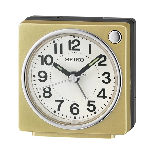 A practical Seiko alarm clock finished with a gold tone, featuring a beep alarm, snooze button, light, quiet sweep second hand and luminescent hands. Measures 7 x 7 x 4cm.