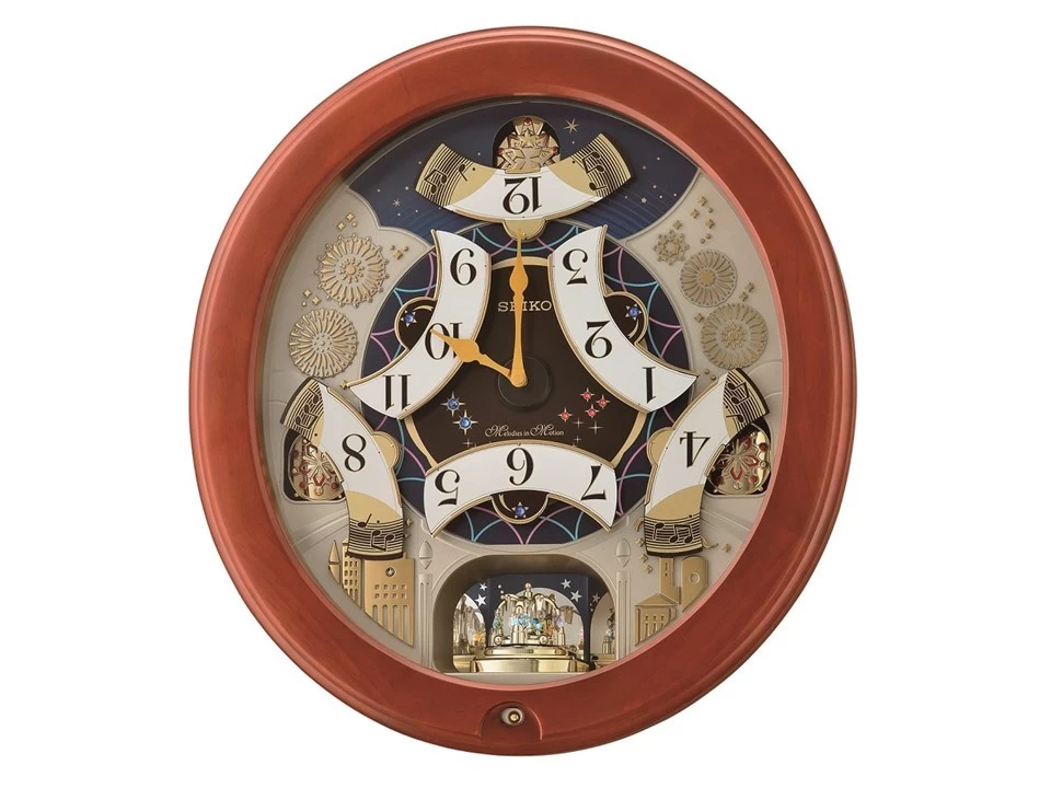 This lovely melodies in motion wall clock from Seiko has a beautiful decorative dial with Arabic numerals set in a brown wooden case. With 18 melodies and Westminster chimes that change every hour, plus with a light sensor that disengages all melodies when it becomes dark. Adjustable volume control and sound demonstration button make it easy to customise the clock. A one-way rotating pendulum creates a traditional look that blends in perfectly with a variety of home decors. A central part of the dial is brown and ornamented with crystals in red and blue colour. Measures 47.5 x 44 x 10cm.