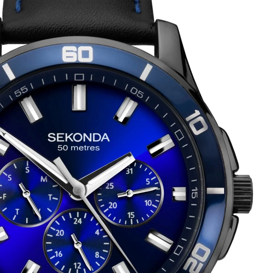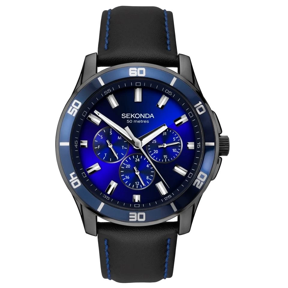 The Sekonda Midnight Blue men’s multi-function watch is the perfect timepiece for men with a bold, on-trend style. This watch features a 43mm gunmetal plated case with a dark blue top ring housing a matching blue sunray dial. The timepiece is fastened with a black leather strap with vibrant blue stitching that sits comfortably on the wrist. With functions including a day/date display, 24-hour read-out and water resistance to 50m, this watch will perfectly suit your varied lifestyle.