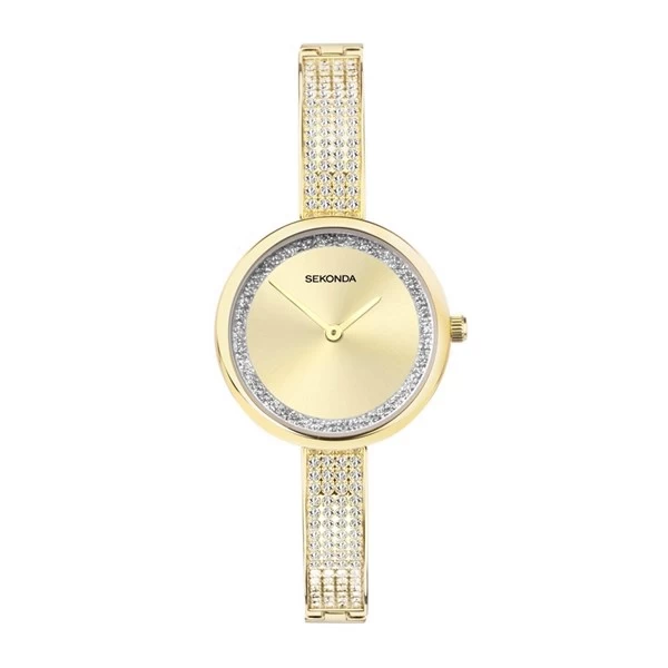 This fabulous ladies watch from Sekonda has a 29mm ion-plated gold tone case and a champagne sunray dial with a silver glitter edge. The watch is fastened with a slim semi-bangle bracelet embellished with 136 crystals.