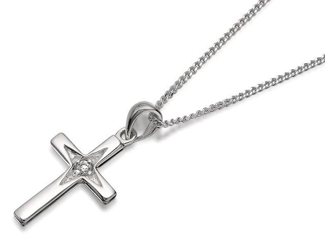 A pretty 11 x 16mm sterling silver cross with just the right little touch of a cubic zirconia nestling in the centre, strung from an 16in/40.5cm chain.