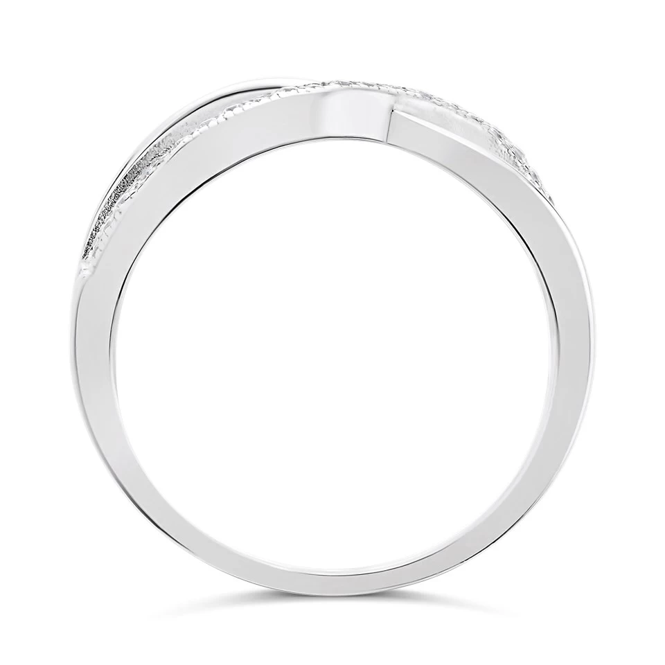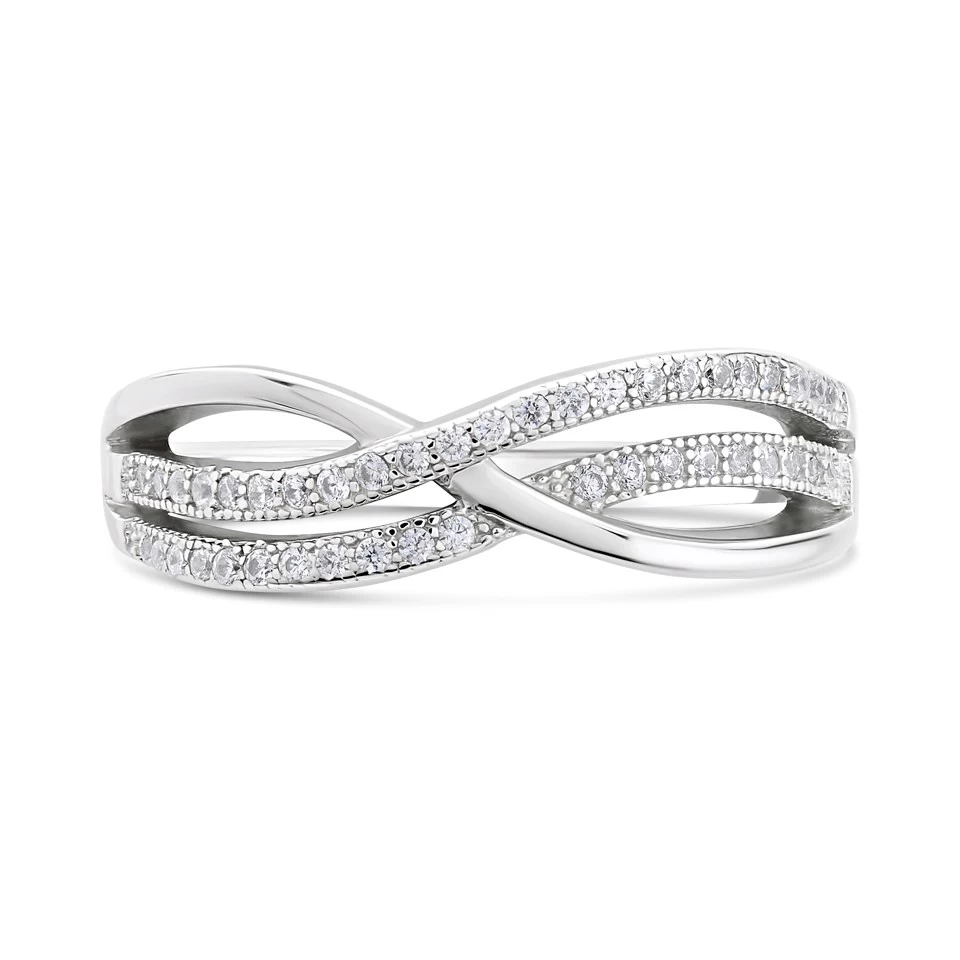 Featuring a three band crossover kiss design, two bands are set with cubic zirconias and one remains plain. Measuring 6mm wide, this sterling silver ring is the perfect accessory for any outfit.