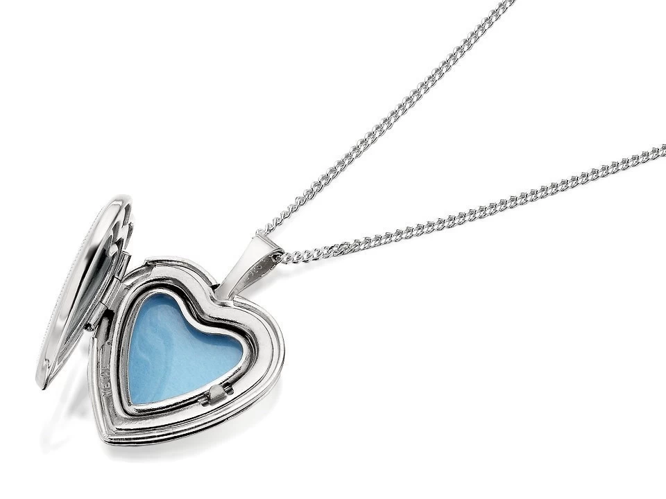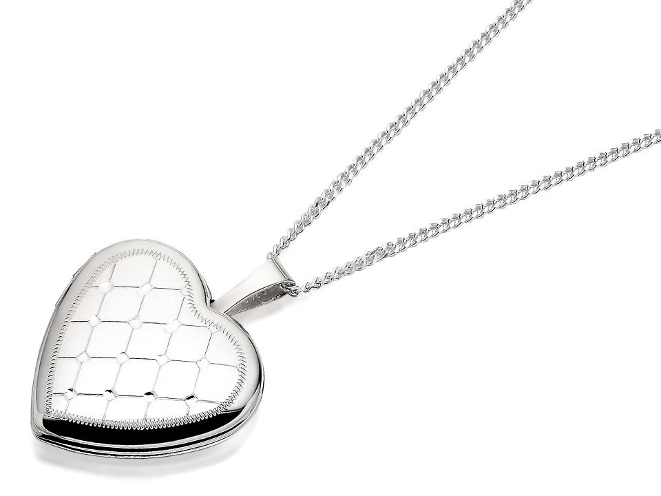A very pretty lattice features on the front face of this 1.6cm heart locket with a matt face for the reverse – opens to reveal two compartments for a photograph or little keepsake, strung from an 18in/45cm chain.