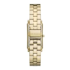 With a rectangular shaped case, this gold plated ladies watch from Skagen features a 22 x 7mm gold plated stainless steel case housing a matching dial with gold tone baton hour markers and hands. A double push button clasp bracelet completes the look. 30m water resistant.