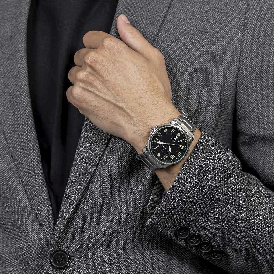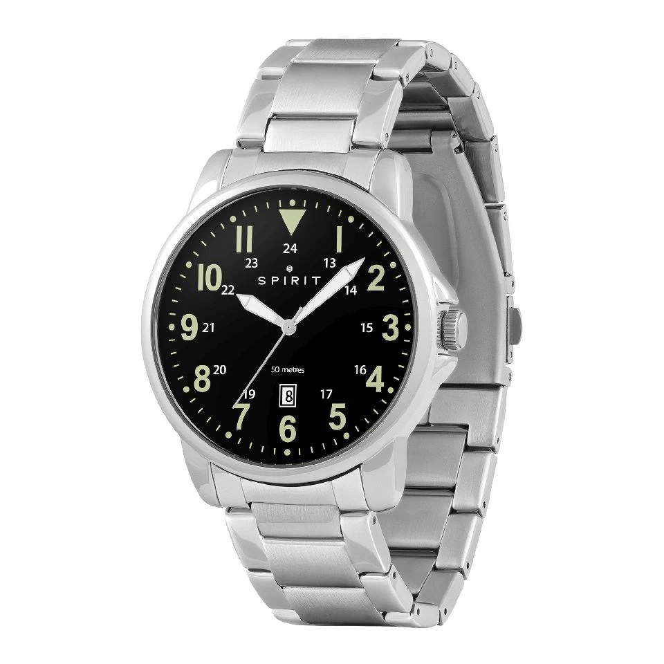 A military style men’s watch from Spirit featuring a 43 x 9.5mm stainless backed case housing a black dial with green number hour markers and white hands. There is also a date display window. Finished with a brushed and polished bracelet with double push button folding clasp. 50m water resistant.