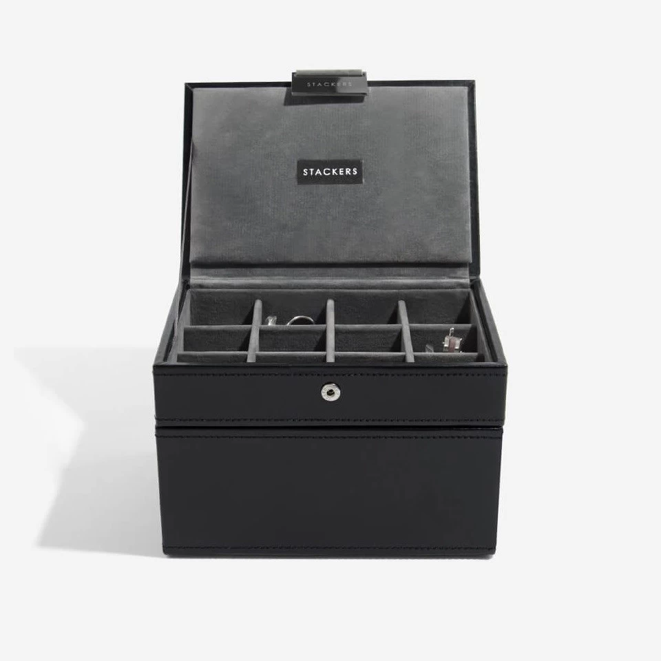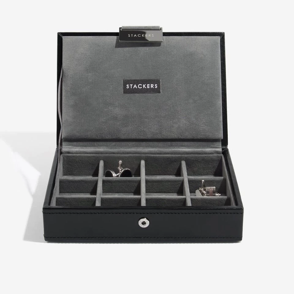 Keep your jewellery, watches and accessories organised at home, with this black cufflink and watch box from Stackers. Featuring 12 internal small compartments and two larger compartment for watches, it makes a great gift too. Measures 12.5 x 18 x 12cm.