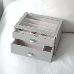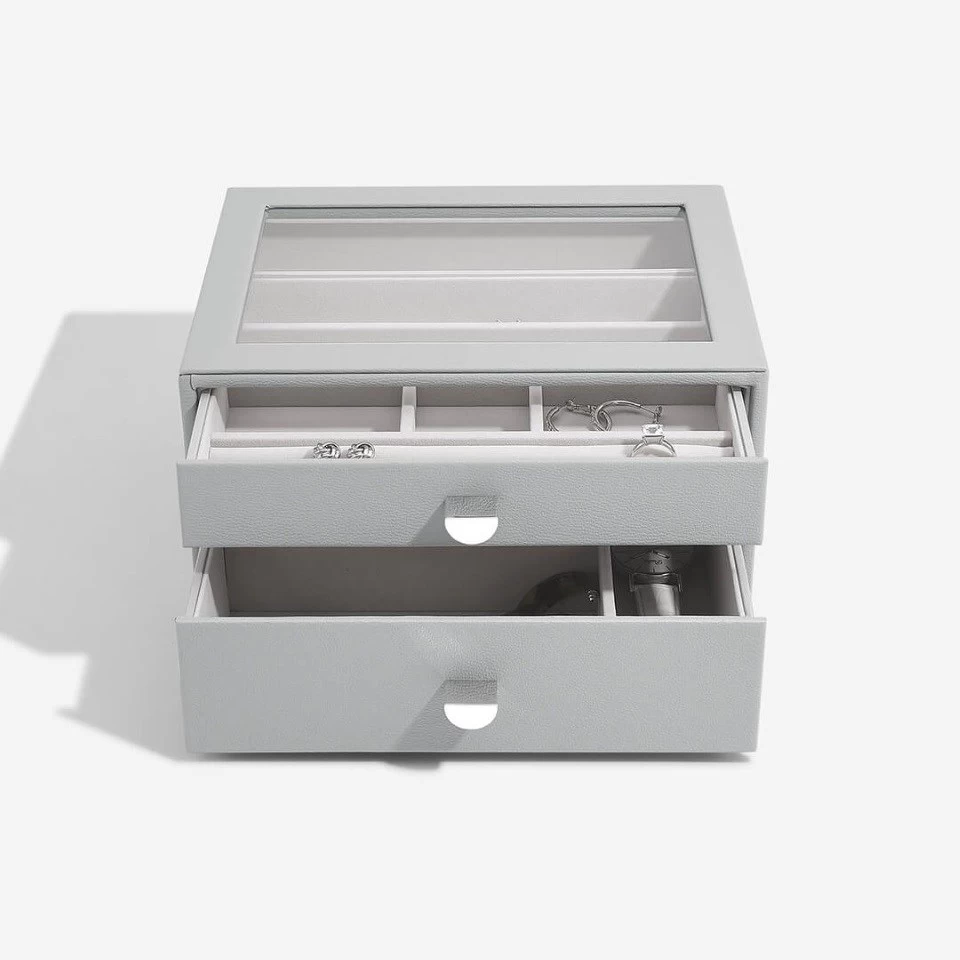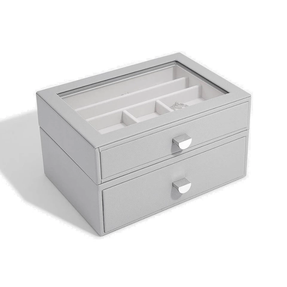 There’ll be no excuse for your favourite jewellery to be anything other than tangle-free and organised. This best-selling Pebble Grey Classic Jewellery Box (set of 2), is ideal for almost every jewellery collection. With plenty of space to keep your necklaces, rings, earrings, watches and more, beautifully organised and safe. It features a clear glass lid for visibility and easy access to your favourite pieces and whatsmore, you can easily add another jewellery drawer layer as your collection grows! Don’t forget you can tailor your jewellery box drawers even further with new layers and accessories. Measures 18 x 25 x 13.8cm.