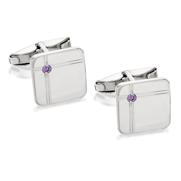 Swivel cufflinks for him or for her – the 1.3cm face features double lining on two edges with an amethyst cubic zirconia at their intersection.