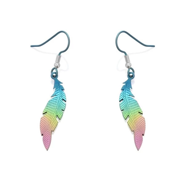 A symbol of hope, balance and good luck, these 45mm long titanium feathers boasts a wonderful rainbow effect front and back, with an engraved finish to the front that really makes them stand out. Lightweight and hypoallergenic, made in the UK.
