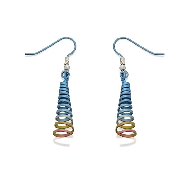 Fun and comfortable titanium hook wire earrings that sees two ‘helter skelters’ coloured in subtle unicorn colours of sky blue through to pale pink. Hypoallergenic and lightweight, they’re finished with comfortable hook wires. Made in the UK, total drop 46mm.
