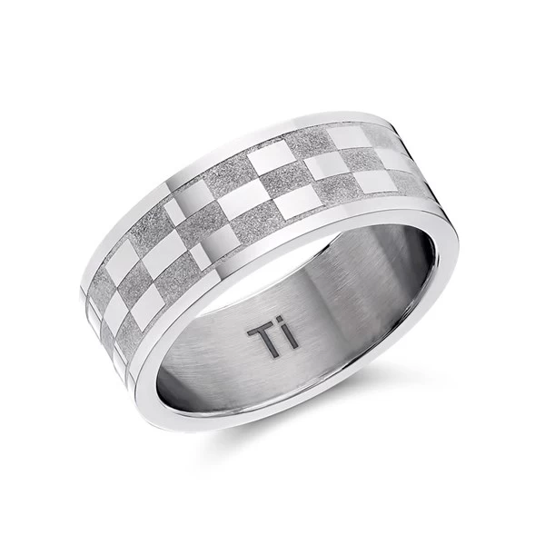 Matt and polished finish rectangles add lots of interest to the inner band of this 8mm wide titanium ring, with a polished finish, plain edge.