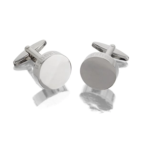 Understated plain round cufflinks measuring 17mm wide. The word ‘usher’ is etched on each cufflink along the 5mm thick edge.