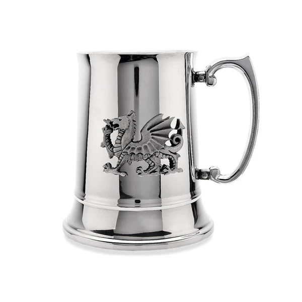 This traditional flared bottom tankard features a cast metal Welsh dragon on the front whilst the rear is left blank should you wish to get it engraved.