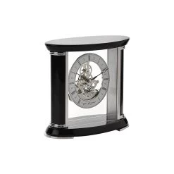 A smart looking mantel clock in a black piano finish, silver tone oval dial with skeleton effect dial and Roman numeral display. Approximate size 21 x 20 x 9cm, requires single AA battery.