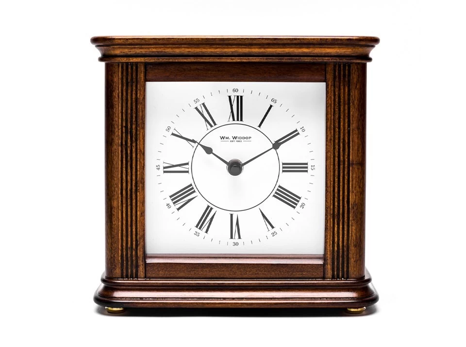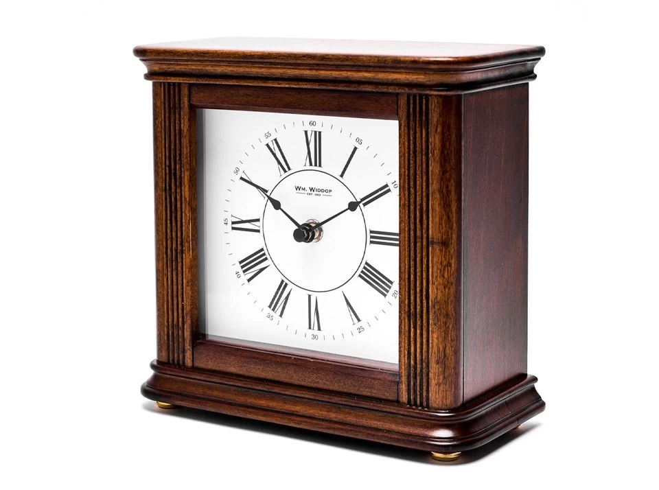A beautiful ornate walnut finish wooden mantel clock with Westminster chime. Walnut finish wooden frame with carved collumn details, square white face with black Roman dial, black spade hands, golden feet details, an ultra-precise quartz movement and high quality Westminster chim. Requires 2 x AA batteries (not included). Measures 19.5 x 20 x 9.5cm.